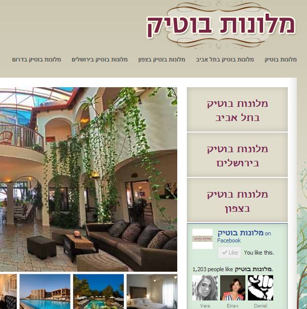 אתר מלונות בוטיק מרכז את מלונות הבוטיק הטובים בישראל, תוכלו להתרשם מהמלונות עם תמונות גדולות ויפות, מידע ברור ומסודר. כל המלונות באתר ניתנים להזמנה ישירה והתשלום במלון. חלק מהמלונות מציגים סיורים וירטואלים מרהיבים ולחק סרטוני וידאו מרשימים.