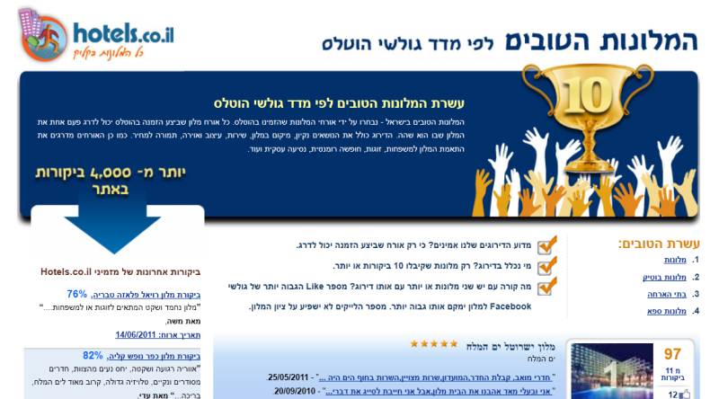 פורטל התיירות הגדול בישראל hotels.co.il מציג מדד מלונות חדש המעניק לכל גולשי האתר אינפורמציה עדכנית ועיניינית על עשרת המלונות הטובים ביותר בישראל בקטגורית מלונות, מלונות ספא, מלונות בוטיק ובתי הארחה, אשר נבחרו ע"י גולשי האתר שביצעו הזמנה ובילו חופשתם במלון.